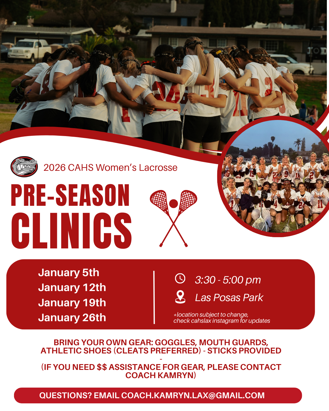 Girls Lacrosse is holding pre-season clinics on 1/5, 1/12, 1/19, and 1/26. View the flyer for more information: Girls Lacrosse Pre-Season Clinics