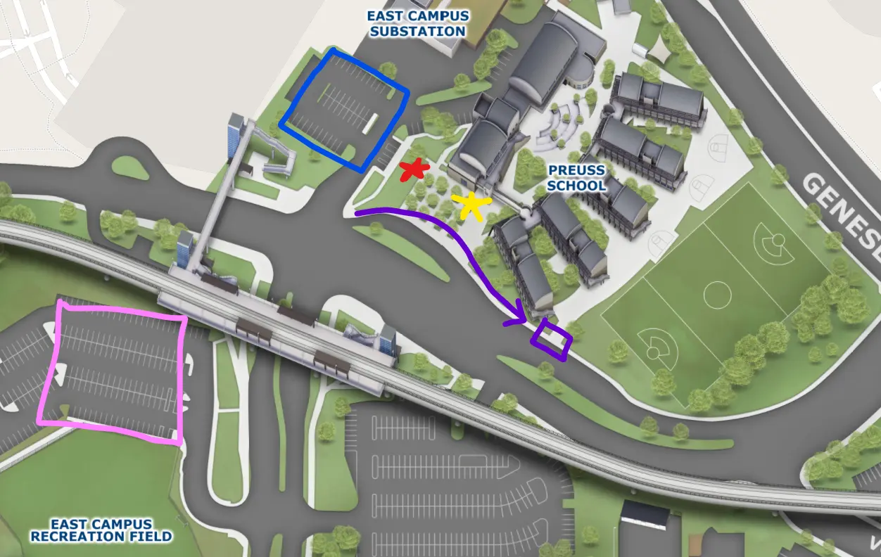The blue box is the dedicated Preuss parking lot – most likely this lot will be full with our faculty and staff. The lot across the street (pink box) is also available to park in. You will need the vehicle’s license plate number but you will not need to place the permit on your dashboard.